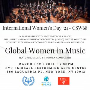 UNSRC Symphony Orchestra in partnership with United Voices 4 PeacepresentGlobal Women in MusicFeaturing music by women composers and performersUNSRC Symphony OrchestraPredrag Vasic, Music DirectorAmy Andersson, guest conductorNirmala Rajasekar,… Read more: Global Women in Music