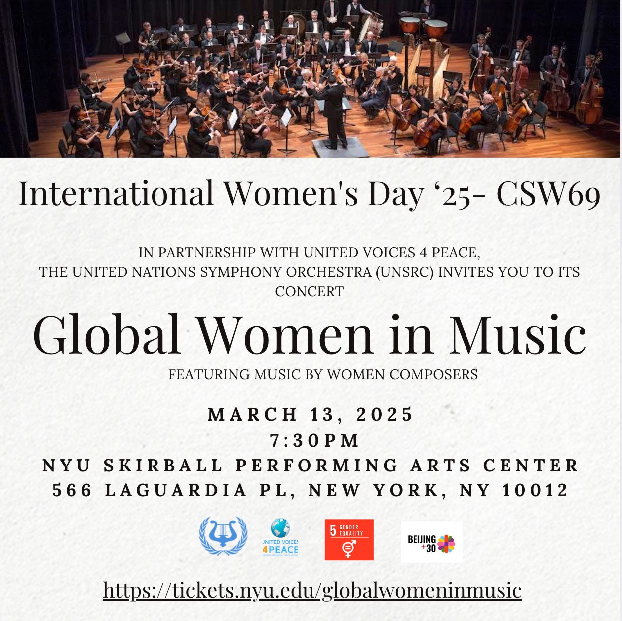 On the occasion of the International Women’s Day 2025 and as an official side event to the United Nations Commission on the Status of Women (UNCSW 69), the UN Symphony Orchestra, in partnership with United Voices for Peace, presents our “Global Women in Music” initiative featuring works by female composers from around the world, to advance gender equality.